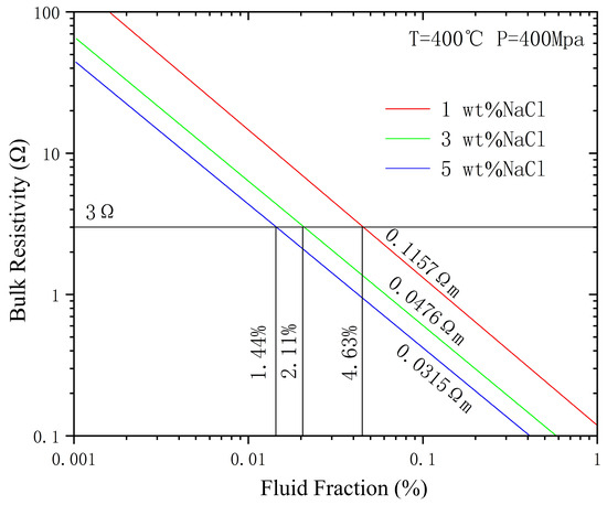 Relationship between electrical resistivity and fluid fraction for 1 wt%, 3 wt%, and 5 wt% nacl saline fluids, modified from Dong et al. (2023) [14].