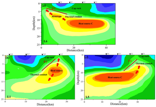 Geothermal system conceptual model of the study area. (a) profile l6-based structural-thermal model; (b) profile l1-based structural-thermal model; (c) profile l5-based structural-thermal model.