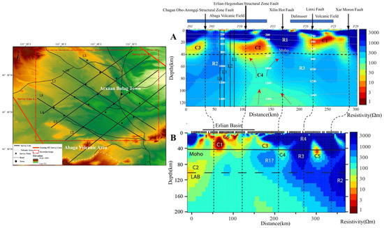 (A) Distribution of magnetotelluric survey lines in the study and adjacent areas; (B) resistivity inversion profiles of lines A and B, modified from Ye et al. (2022) [74].
