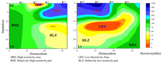 (a) Resistivity layering profile along survey line l8; (b) resistivity layering Profile along Survey Line L1.