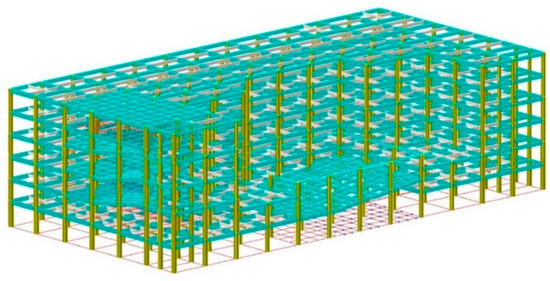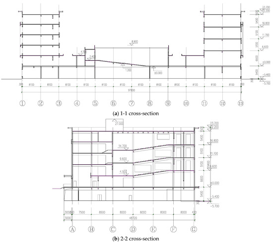 The research objective was an experimental center featuring a reinforced concrete frame structure with a staggered floor design for a multi-room science and technology lecture theatre [30]. The building’s structural design is primarily based on the Code for Design of Concrete Structures [31] and the Code for Seismic Design of Buildings [32]. The building measured 97.8 m in length, 48.6 m in width, and 29.4 m in height, with six floors. It was classified as category 2, with a design service life of 50 years. The frame seismic grade was one, the structural safety grade was two, and the seismic defense classification was category C. The seismic fortification intensity was eight degrees, with a design basic seismic acceleration of 0.20 g. The site category was category two, and the classification of the seismic design was the first group.