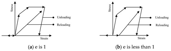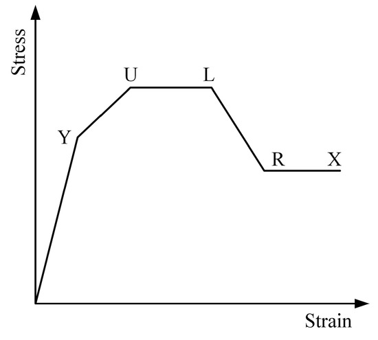 Steel has a strong energy dissipation capacity, so its hysteretic loops is full in shape. Figure 6 shows the ideal elastic–plastic hysteretic model with stiffness degradation, i.e., when the “EPP” model is adopted for steel. Given that the “EPP” model is used for the steel constitutive relation in this paper, with reference to Reference [35], the energy degradation factor “e” for steel reinforcement and steel tubes is set to 1.0 at the yield point and 0.85 at the maximum strain point. Three additional points are determined by linear interpolation between these two points, with their energy degradation factors “e” defined as 1.0, 0.95, and 0.9, respectively.