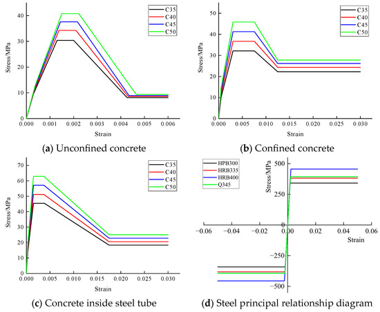 For staggered floor structures incorporating ST-RC columns, the constitutive model for concrete is defined as follows: unconfined concrete outside the stirrup, confined concrete inside the stirrup, and concrete inside the steel tube were based on the Simple model [31], Mander model [33], and the uniaxial compression constitutive model for circular steel pipe concrete proposed by Han [34]. Because the PERFORM-3D 8.0 software provides only generalized material constitutive skeleton curves, three kinds of concrete constitutive curves for four different strength classes require fitting. The selected curves consider strength loss without tension consideration, and the skeleton curve is shown in Figure 3, where point Y is the yield point of the concrete, and the concrete strength enters into the plateau stage starting from point U. Point L indicates the end of the plateau stage, and thereafter the concrete strength enters into the degradation stage. Point X is the failure point of the material, which is also the point at which the program stops calculating, and R is the starting point of residual bearing capacity. The fitted concrete constitutive curves are shown in Figure 4a–c. The steel constitutive skeleton curve was selected from the “Elastic-Perfectly Plastic” model without considering strength loss, as depicted in Figure 4d.