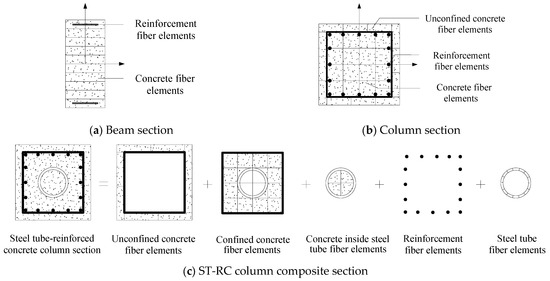 The ST-RC column section was divided into eight fibers for unconfined concrete, sixteen fibers for confined concrete, four fibers for concrete inside steel tube, sixteen fibers for longitudinal reinforcement, and fourteen fibers for the steel tube. Notably, the area of the steel tube fibers was greater than that of the longitudinal reinforcement fibers. The fiber division diagram is shown in Figure 7c.