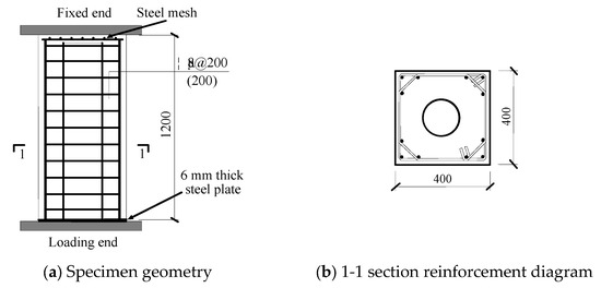 In this study, two specimens, CSTRC2 and CSTRC5, from the axial compressive performance tests of ST-RC columns conducted by Jia et al. [35] and Liu et al. [36] from Huaqiao University, were selected for validation of finite element analysis. The specimens had a section size of 400 mm × 400 mm and a height of 1200 mm. The longitudinal reinforcement comprised 12 HRB335 grade steel bars with a diameter of 16 mm, and the stirrup adopted octagonal composite stirrups with a diameter of 8 mm of HPB300 grade, spaced at 100 mm. A hot-rolled seamless steel tube was used for the steel tube. The test loading device had a fixed end with a 50 mm × 50 mm steel mesh and a loading end with a 6 mm thick steel plate. The geometric dimensions of the specimens and reinforcement diagram of the ST-RC column [35,36] are shown in Figure 8.