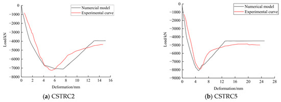 The displacement loading method was employed to simulate the test loading, and the comparison of the load–deformation curves is shown in Figure 9, illustrating an excellent fitting between the curves. Table 7 presents the peak load Nu from the test and the peak load Ncu from the finite element simulation, indicating a close alignment between the simulated and tested peak loads. Overall, the simulation results exhibited a small error, indicating the reasonableness and effectiveness of the material principal structure selection as well as the fiber division of the section.