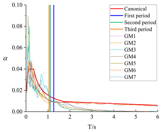 According to the above principles, the basic information of the original seismic waves is shown in Table 10. A comparison of the multi-wave response spectrum with the canonical response spectrum is shown in Figure 11, from which it can be seen that the multi-wave response spectrum matches the code response spectrum curve to a high degree [39]. Table 11 displays the deviation statistics for the spectral values of the ground motion response spectrum and the canonical response spectrum at key structural periodic points. The average seismic response spectrum curves of the seven seismic waves compared with the canonical response spectrum of the first three vibration modes showed differences of less than 0.2. This indicated the statistical consistency and confirmed the suitability of the selected seismic waves.