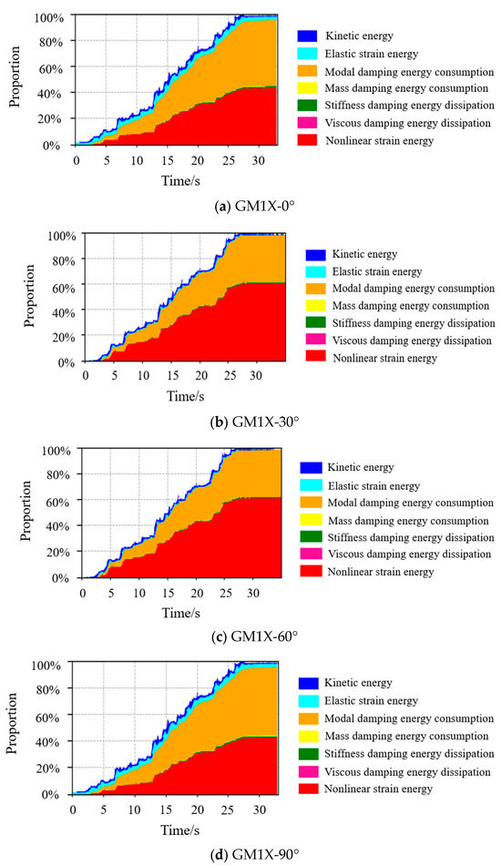 Under earthquake action, the performance of a building undergoes a continuous degradation process, and the inter-story drift ratio, as an envelope value of seismic indicators [40], cannot measure the changes in this process. However, the proportion of overall nonlinear energy dissipation of the structure can reflect the degree of nonlinear response of the structure. Analyzing the proportion of energy values in the structure allows for the study of changes in structural performance, which is of great significance for the seismic performance evaluation of the structure.