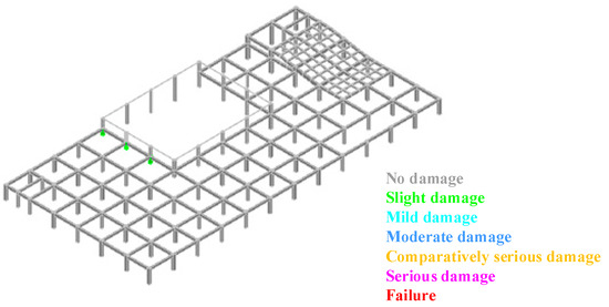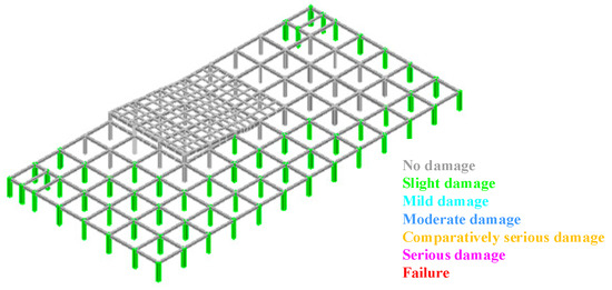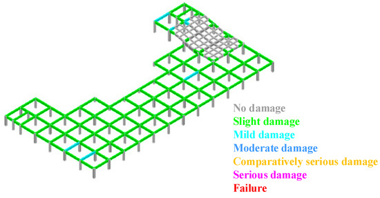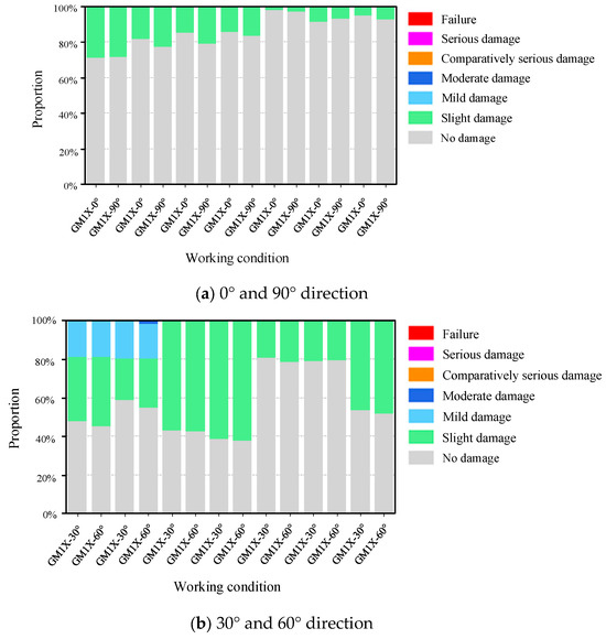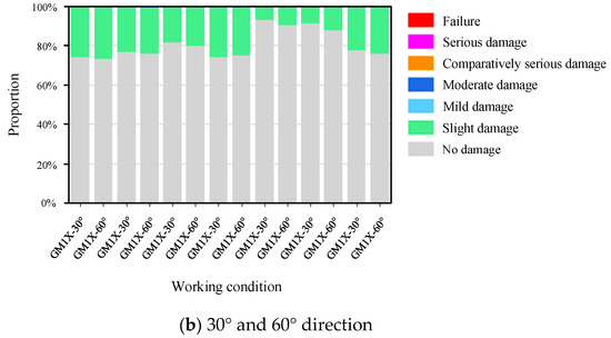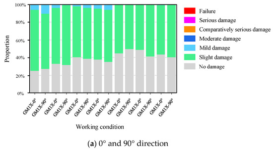 The statistical results for the performance states of ST-RC columns under different seismic conditions (0°, 30°, 60°, and 90° directions) are depicted in Figure 20a,b, with the average values summarized in Table 23. The damage degrees in the 0°, 30°, 60°, and 90° directions were similar, as shown in Table 23. This is because the ST-RC columns were positioned at the internal staggered floor rather than at the structural boundary. Their load-carrying capacity primarily depended on the concrete inside the steel tube, which was designed to be circular with axisymmetric characteristics, reducing the effect of seismic directionality to a certain extent. The ST-RC columns were primarily undamaged, with an average undamaged state of 93% across all four directions, which is significantly better compared to conventional frame columns. This is attributed to the presence of the steel tube, which confines the concrete inside, enhancing the axial load-bearing capacity and ductility. Additionally, the reinforced concrete outside the steel tube provides a certain degree of confinement to the internal steel tube. However, under the GM3Y-60° and GM4Y-60° conditions, comparatively severe damage was observed, reaching 1.16%. In light of the discrete nature of seismic waves, the deformation of ST-RC columns remained satisfactory under most working conditions, satisfying the requirements for performance level 4. The results demonstrated that the seismic performance of ST-RC columns designed according to current codes was robust even under an eight-degree rare earthquake. Figure 21 shows the diagram of the positive section performance state of ST-RC columns on the second floor under the envelope values of earthquake conditions. Among all floors, the ST-RC columns on the second floor are in the most severely damaged state, with the proportion of slight damage being 10.00%.