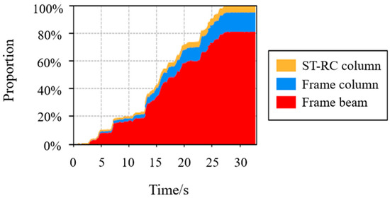 Using the GM1X-0° case as an example, the energy-dissipation diagram in Figure 22 illustrates that the frame beam, as an energy-consuming member, initially absorbed seismic effects. The frame and ST-RC columns began to absorb a small amount of energy nearly simultaneously at approximately 2 s. Although there was a slight increase in the energy dissipation ratio of these column types at 3 s, the frame beam still exhibited the highest dissipation ratio and rate of increase. By 4.6 s, the energy dissipation ratios for the frame beam and frame column were 6.99%, 1.21%, and 0.39% for the ST-RC column, respectively. At this point, the frame column’s energy dissipation ratio exceeded 1% for the first time, indicating that it surpassed that of the ST-RC column in terms of the energy dissipation ratio. The ST-RC column surpassed the 1% energy dissipation ratio at 12.9 s. Following the trend of framed beams exhibiting the fastest increase in energy dissipation percentage, at 32.9 s, the frame beams consumed 81.34% of the energy, frame columns consume 14.21%, and ST-RC columns consume 4.45%. Therefore, during an earthquake, the energy dissipation sequence was initiated by the frame beams, followed by two types of columns. The frame beam consistently maintained the highest energy–dissipation rate, followed by the frame column.