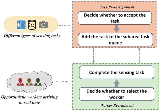 The workflow of the proposed real-time task assignment model is illustrated in Figure 1, highlighting the two-stage process. The model consists of two stages: task pre-assignment and worker recruitment. The task pre-assignment stage handles different types of real-time arriving sensing tasks. It determines whether to take on a task. If a new task is accepted, the MCS platform will assign it to a subarea based on the task requirements. The worker recruitment stage handles real-time arriving opportunistic sensing workers, selecting suitable workers to execute the sensing tasks. These two stages operate in parallel, with worker recruitment starting as soon as there are tasks in the subarea task queue. In this section, we provide a detailed introduction to the proposed real-time task assignment model and its optimization objectives.
