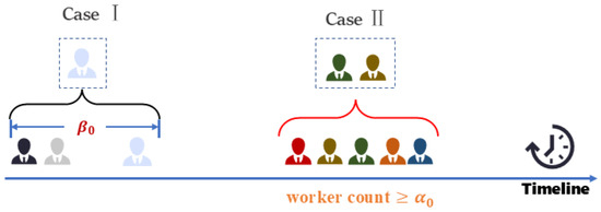 The online recruitment algorithm needs to generate the recruitment results within a short period of time, which imposes strict requirements on time complexity. Therefore, commonly used optimization algorithms with high time complexity, such as genetic algorithms or bipartite graph algorithms, may not be suitable for this application scenario. To balance optimization effectiveness and the speed of generating a solution, we designed a real-time worker recruitment method. The process of worker recruitment is shown in Figure 3. As described in the system model in Section 3.1, this paper does not assign workers immediately upon arrival. According to this character, this method will select workers in the following two scenarios, as shown in Figure 3.
