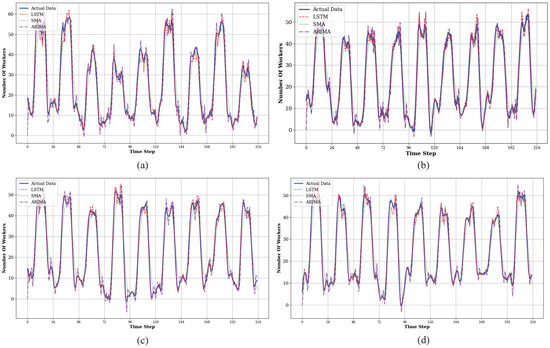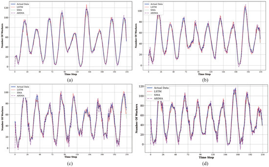 Prediction results for worker quantity on Foursquare dataset. (a) Subarea 5. (b) Subarea 6. (c) Subarea 7. (d) Subarea 8.