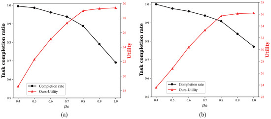 To determine an appropriate value for the task load threshold and to investigate its impact on system performance, we conducted a parameter sensitivity analysis. In this experiment, we varied the task load threshold, , from 0.4 to 1.0 while keeping all other parameters constant. We then observed the resulting changes in total platform utility, task completion rate, and the number of accepted tasks. The results of this analysis under two different instances are presented in Figure 6a,b. Both figures indicate that as increases, the platform adopts a more lenient task acceptance policy, leading to a rise in both the number of accepted tasks and the total platform utility. However, this strategy comes at the cost of a significant decline in the task completion rate, as a higher threshold causes the platform to accept more tasks than it can reliably handle.