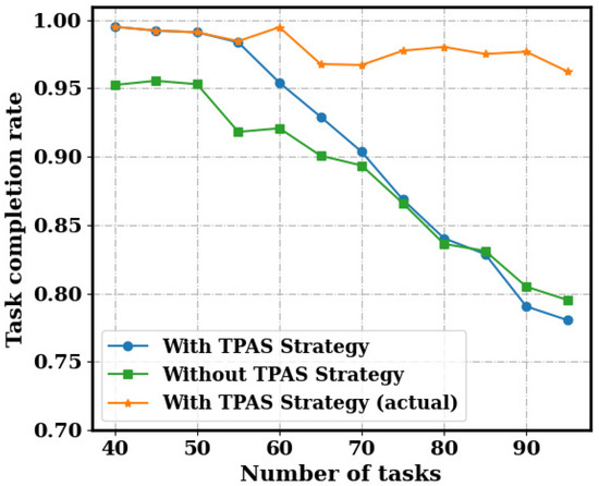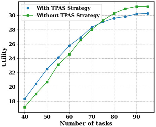 Additionally, we compare the utility in both cases, as shown in Figure 8. It can be observed that the proposed TPAS strategy significantly improves the overall quality of the selected workers by balancing the task load across subareas, especially when the number of tasks is small, outperforming the case without the strategy. As the number of tasks increases, the task pre-assignment strategy no longer accepts sensing tasks that exceed the load capacity of the sensing platform, causing its utility value to stabilize and cease increasing. In contrast, without the strategy, sensing tasks continue to be accepted, resulting in a utility value that gradually exceeds that of the strategy. However, as shown in Figure 7, the task completion rate in this scenario has already dropped to a low level.