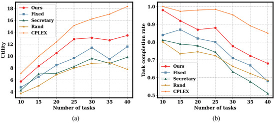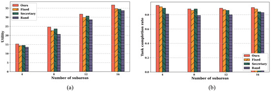 Performance comparison under different subareas. (a) Utility comparison. (b) Task completion rate comparison.