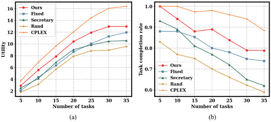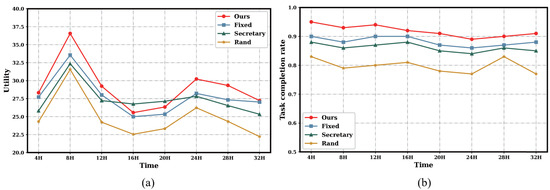 Performance comparison over a continuous simulation period. (a) Utility comparison. (b) Task completion rate comparison.