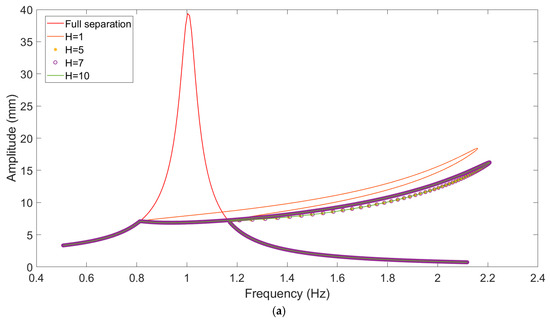 From Figure 20a,b, the difference between the two calculations is clearly evident. In the case with a positive gap value, there is no intermittent contact, allowing the natural continuation scheme to converge successfully without the need for the arc length continuation method. This computation was carried out using 27 time samples per period.