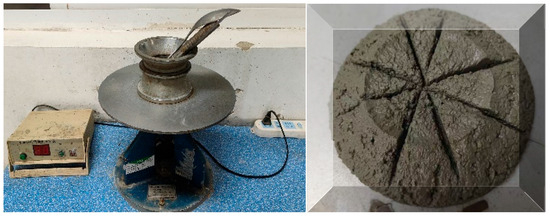 The fluidity of cement mortar was determined according to the Test Method for Fluidity of Cement Mortar (GB/T 2419-2005) [32]. After the mixed mortar was poured into a conical frustum mold mounted on the flow table apparatus, the spread diameters were measured to assess flow characteristics, with the experimental setup and procedure documented in Figure 1.