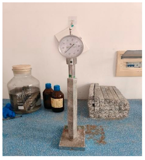 Dry shrinkage testing was performed according to the Test Method for Drying Shrinkage of Cement Mortar (JC/T 603-2004) [34], employing 25 mm × 25 mm × 280 mm prismatic specimens with embedded gauge studs cast in a three-gang mold assembly comprising orthogonal baffles, end plates, baseplates, and positioning screws [8,35]. After casting and initial curing, the specimens were transferred to a specialized shrinkage chamber maintained at (20 ± 3) °C with (50 ± 4)% relative humidity [36]. The measuring epochs commenced upon demolding, with specimen lengths recorded at 1, 3, 7, 28, 60, and 90 days using a precision length comparator, as shown in Figure 4.
