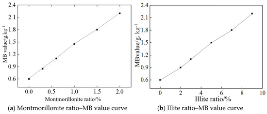 As shown in Figure 5, the MB value exhibits a linearly increasing trend with the rising content of both montmorillonite and illite, while the growth rate for montmorillonite addition is nearly five times faster than that for illite [40]. As the montmorillonite content increases from 0% to 2%, the MB value rises from 0.6 to 2.2, whereas with the illite content increasing from 0% to 9%, the MB value also increases from 0.6 to 2.2. This indicates that montmorillonite exerts a more significant influence on the MB value than illite, and the impact of different clay types on the MB value can vary substantially [41].