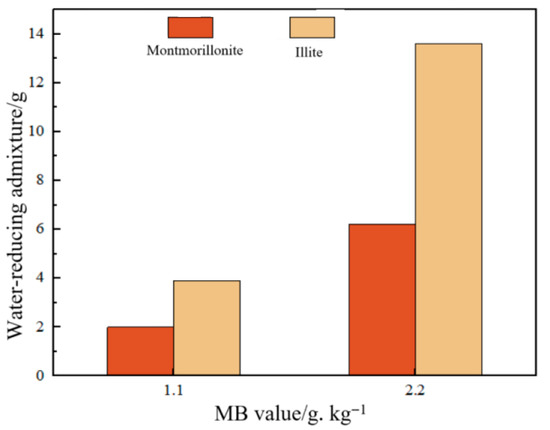 The water-to-cement ratio and superplasticizer dosage serve as critical benchmarks for evaluating the impact of various clay fines on mortar workability [43]. When mortar fluidity is controlled at (170 ± 5) mm with identical mix proportions, the required superplasticizer dosages for different clay fines are as illustrated in Figure 6. An analysis of Figure 6 and Table 1 reveals that at an MB value of 1.1, the required montmorillonite and illite contents are 8.1 g and 40.5 g, respectively, while the corresponding superplasticizer dosages to maintain equivalent fluidity are 2 g and 3.9 g, indicating that illite demands 1.95 times more superplasticizer than montmorillonite. At an MB value of 2.2, the montmorillonite and illite contents increase to 27 g and 121.5 g, respectively, with superplasticizer dosages rising to 6.2 g and 13.6 g. Here, illite requires 2.19 times more superplasticizer than montmorillonite [44]. These results demonstrate that illite exhibits a stronger adsorption capacity for the superplasticizer compared to montmorillonite at identical MB values and fluidity levels, with this disparity amplifying as MB values increase. Furthermore, achieving the same MB value necessitates substantially higher illite content than montmorillonite, which directly contributes to illite’s elevated superplasticizer demand.