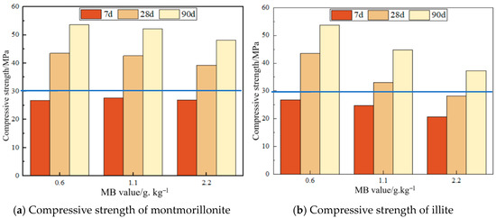 Figure 7b reveals a consistently declining compressive strength in illites at 7d, 28d, and 90d curing ages with increasing MB values under identical flowability. Specifically, an MB elevation from 0.6 to 1.1 reduced the 7d strength from 26.8 MPa to 24.7 MPa, representing a 7.8% reduction; the 28d strength from 43.5 MPa to 33.1 MPa, signifying a 23.9% reduction; and the 90d strength from 53.7 MPa to 44.8 MPa, indicating a 16.6% reduction. A further MB increase from 0.6 to 2.2 decreased the 7d strength to 20.7 MPa, with a 22.8% reduction; the 28d strength to 28.2 MPa, exhibiting a 35.2% reduction; and the 90d strength to 37.3 MPa, showing a 30.5% reduction in both MB increment ranges, from 0.6 to 1.1 and from 0.6 to 2.2, which demonstrated an initial increase followed by a decrease in compressive strength reduction magnitude with prolonged curing ages, with the trend becoming more evident under higher MB elevations.