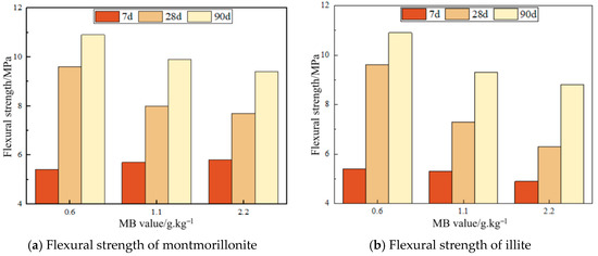 Figure 8b indicates a decreasing flexural strength in illite across 7d, 28d, and 90d curing ages with rising MB values under equivalent flowability. Specifically, an MB increase from 0.6 to 1.1 marginally reduced the 7d strength from 5.4 MPa to 5.3 MPa, remaining essentially unchanged, while substantially reducing the 28d strength from 9.6 MPa to 7.3 MPa, marking a 24.0 percent reduction, and lowering the 90d strength from 10.9 MPa to 9.3 MPa, reflecting a 14.7 percent reduction. Further MB elevation from 0.6 to 2.2 decreased the 7d strength to 4.9 MPa, with a 9.3 percent reduction, the 28d strength to 6.3 MPa, showing a 34.3 percent reduction, and the 90d strength to 8.8 MPa, indicating a 19.3 percent reduction. Both MB enhancement intervals from 0.6 to 1.1 and from 0.6 to 2.2 exhibited an initial increase followed by a decrease in strength reduction magnitude with prolonged aging, where the 0.6-to-1.1 group demonstrated more pronounced trends at both enhancement and attenuation stages.
