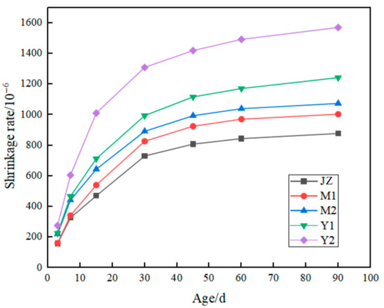 Figure 9 presents the specimen length measurements at 1d, 3d, 7d, 14d, 28d, 45d, 60d, and 90d alongside calculated drying shrinkage rates. The results demonstrate progressive shrinkage escalation with curing age, where MB value exerts substantial influence, particularly on early-stage drying shrinkage. During later phases, hydration decelerates as the adsorbed moisture in clay fines partially releases, shifting the dominant shrinkage mechanism to autogenous drying with attenuated growth rates [45]. Mortars containing identical clay types exhibit elevated shrinkage with increasing MB values, though specimens at MB = 2.2 unexpectedly manifest lower shrinkage than MB = 1.1 counterparts, indicating clay content predominance over MB value in shrinkage modulation.