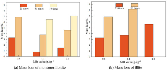 As an expansive clay mineral, montmorillonite possesses a high specific surface area and cation exchange capacity. Its interlayers are weakly bonded via van der Waals forces, allowing interlayer cations such as Na+ and Ca2+ to exchange with cations in the MB solution, thereby adsorbing more MB [42], hence the rapid increase in MB value with rising montmorillonite content. In illite, K+ ions are fixed and non-exchangeable, limiting MB adsorption to external surfaces where adsorption capacity is governed by the specific surface area. Additionally, the interlayer expansibility of illite is weaker than that of montmorillonite, resulting in its lesser impact on the MB value.