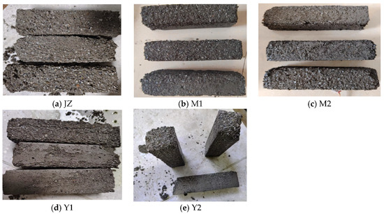 Figure 10 shows the mass loss of mortars with varied MB values. Figure 11 shows a freeze–thaw damage phenomenon under different conditions. These figures indicate that frost resistance grading criteria require a post-cycling mass loss below 5% and a relative dynamic elastic modulus exceeding 60%. The experimental results demonstrate that M1 and M2 mortars exhibit optimal frost resistance after 75 cycles (mass loss greater than 5%), with M2 showing greater mass loss than M1. Y2 mortar displays the poorest performance (mass loss greater than 5% after 25 cycles). The reference mortar and Y1 mortar exceed a 5% mass loss after 50 cycles, yet Y1 experiences higher mass loss than the reference. Montmorillonite-based mortars demonstrate enhanced frost resistance with increasing MB values, whereas illite-based mortars exhibit the opposite trend [46]. This observation confirms the dominant influence of clay content, where 2% or less clay fines improve frost resistance, while 3% or more prove detrimental. When assuming homogeneous dispersion within mortar matrices, limited clay fines refine pore structures through void filling and moisture migration path blocking. However, excessive clay fines, particularly porous varieties, absorb substantial capillary water, and their weakened capillary walls, when compared with conventional mortar, fracture under cyclic freezing conditions, thereby accelerating frost resistance degradation.