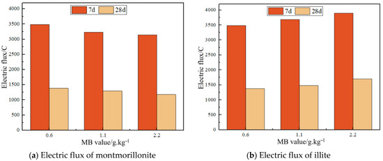 Figure 12 illustrates charge passed measurements reflecting chloride permeability of specimens at 7d and 28d curing ages under varying MB values, where a consistent charge passed reduction occurred with increasing MB values in montmorillonite mortars at both ages. Concurrently, a charge passed elevation was observed in illite mortars, indicating superior chloride permeability resistance compared to JZ for montmorillonite yet inferior performance for illite [47]. This further suggests significant clay content influence on impermeability, specifically that a clay content below 2% enhances mortar impermeability, while exceeding 3% deteriorates it, with the results aligning with the frost resistance test findings.