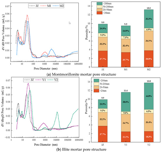 Mercury intrusion porosimetry on 28d-cured specimens established pore structure evolution patterns, classifying pores into four categories, pores below 20 nm as harmless, 20 to 50 nm as less harmful, 50 to 200 nm as harmful, and above 200 nm as multi-harmful, with the porosity, pore size distribution, average pore diameter, and median pore diameter provided in Table 4. The results reveal that the montmorillonite mortar porosity initially decreased then increased with rising MB values, while the illite mortar porosity consistently increased [39]; concurrently, both average and median pore diameters enlarged with MB increments. M1 exhibited comparable harmless and multi-harmful pores to JZ yet attained the lowest porosity, demonstrating that limited clay content reduces mortar porosity via a filling mechanism.