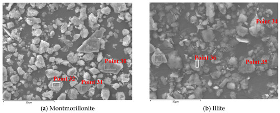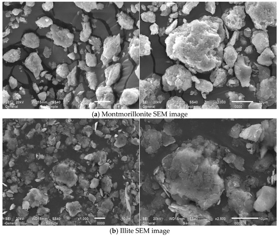 Figure 14 presents magnified SEM images of the montmorillonite and illite used in the experiments, revealing montmorillonite particles with rough, porous surfaces characterized by multi-layered stratification that features interlamellar pores visible between layers and irregularly curved edges, while illite particles exhibit smoother, denser surfaces with less undulation and comparatively straighter edges than montmorillonite.
