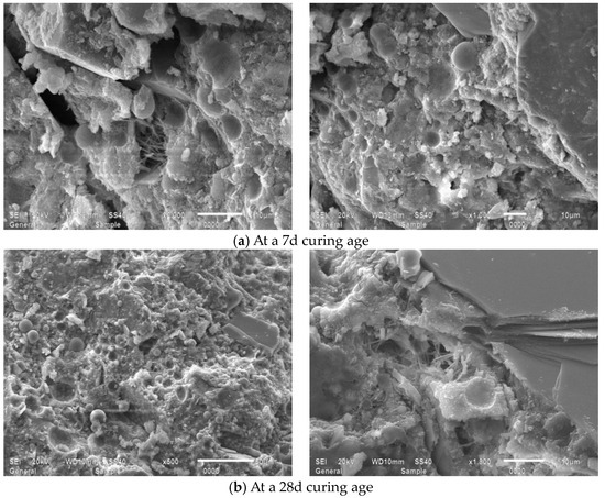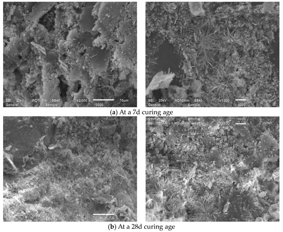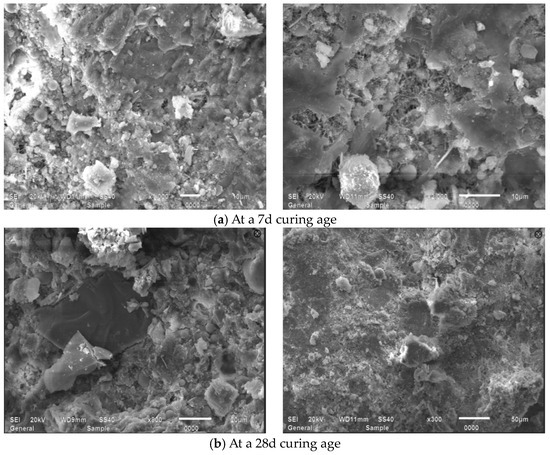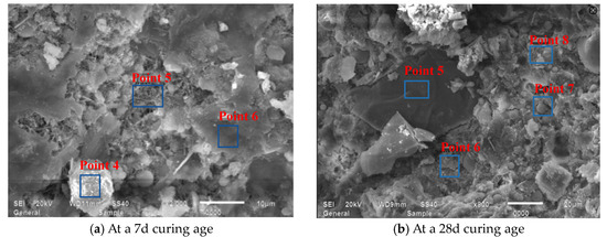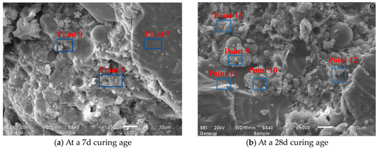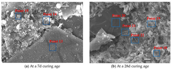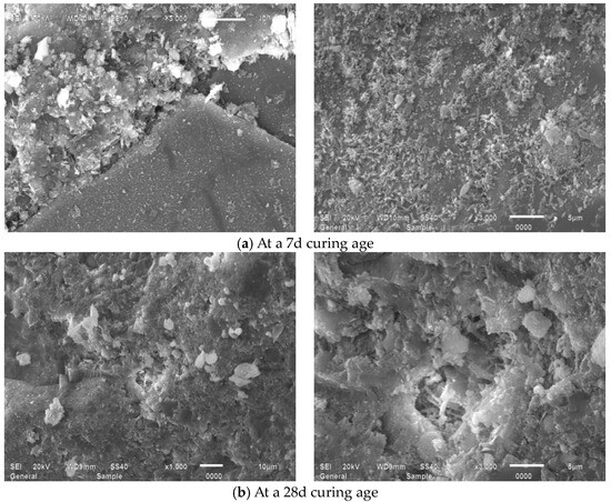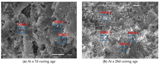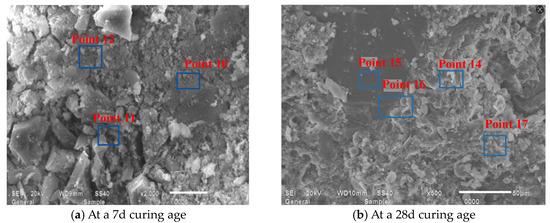 Figure 15 presents SEM observations of JZ specimens sectioned into 15 mm × 15 mm × 15 mm at 7-day and 28-day curing ages, revealing that at 7 days, the reference mortar contains amorphous flocculent C-S-H gel, minor acicular AFt crystals, hexagonal platy portlandite (CH), and irregular flat particles, where unhydrated cement particles interweave with hydration products to form the internal microstructure while exhibiting discernible voids, indicating partial yet incomplete hydration [49]. At 28 days, substantially increased amorphous C-S-H gel forms interconnected honeycomb frameworks that coalesce with other hydration products into dense network structures, showing a conspicuous absence of acicular AFt, a significant reduction in unhydrated cement particles, and diminished or refined pores filled by C-S-H gel, collectively evidencing an enhanced hydration degree, amplified reaction products, and progressive pore refinement with extended curing.