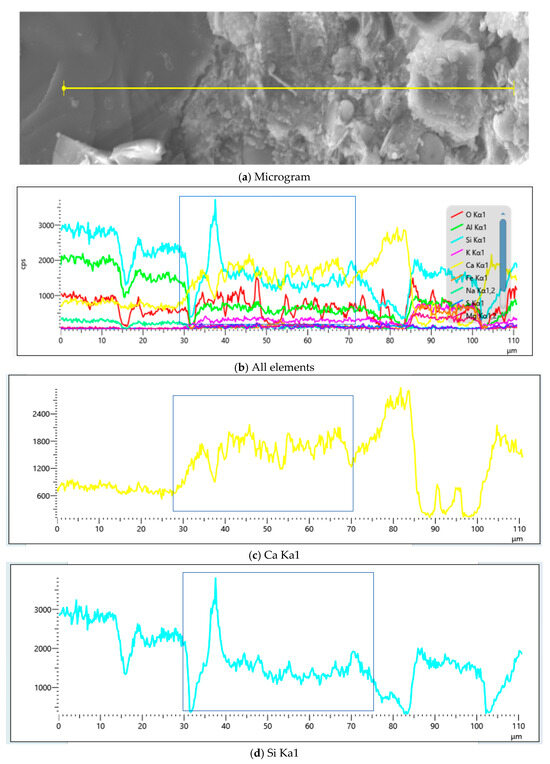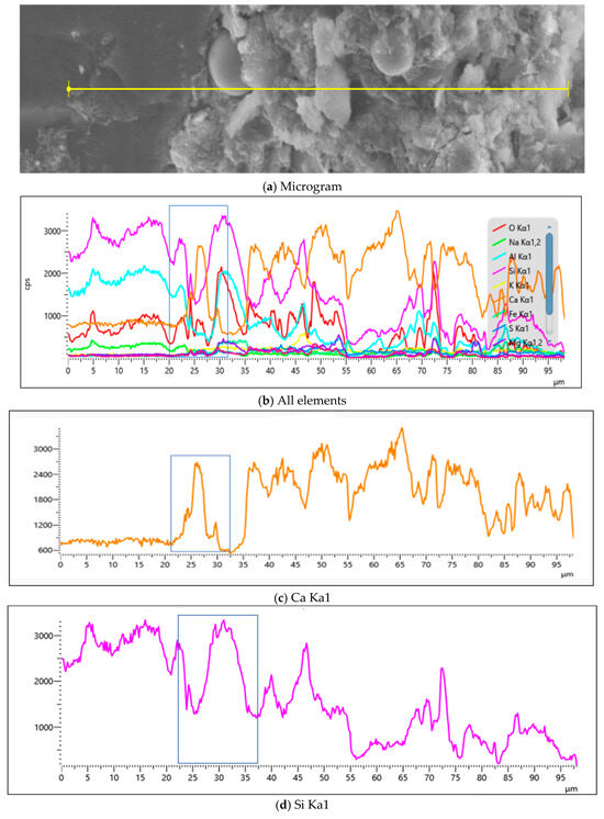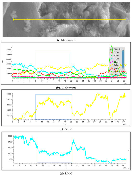 Quantitative ITZ thickness determination through calcium and silicon elemental distribution gradients along designated scan paths revealed ITZ dimensions of 12 to 13 μm for the JZ mortar, 11.5 to 15 μm for the M1 mortar, 20 to 22 μm for the M2 mortar, 29 to 34 μm for the Y1 mortar, and 43 to 46 μm for the Y2 mortar. For identical clay mineralogy, the ITZ thickness exhibited a positive correlation with an increase in MB value, indicating clay content-dependent interfacial deterioration.