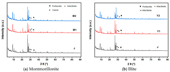 An XRD analysis of the 28-day-cured montmorillonite and illite mortars with varying MB values elucidates impacts on hydration products, revealing such primary constituents as calcium hydroxide, silicon dioxide, ettringite, calcite, dicalcium silicate, and tricalcium silicate. Silicon dioxide originates predominantly from sand, calcium hydroxide derives mainly from cement hydration, and calcite formation results from carbonation of calcium hydroxide [36]. Detectable dicalcium silicate and tricalcium silicate residues in the mortars M2, Y1, and Y2 indicate incomplete cement hydration at this stage, as evidenced in Figure 32.