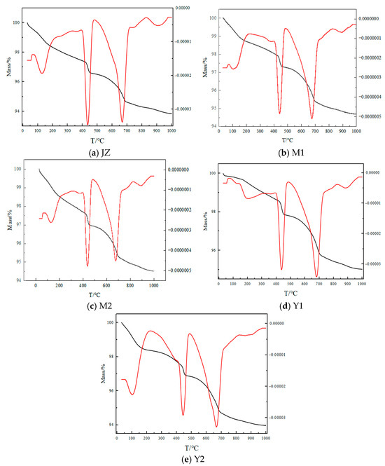 Y2, displaying an MB value of 2.2, exhibits an initial mass-loss trough from 60 °C to 200 °C that is identical to JZ, with a contracted thermal decomposition range and a 1.12% mass loss below JZ, confirming that 9% illite incorporation influences decomposition during the first two mortar stages. This is followed by a second trough between 400 °C and 480 °C, demonstrating a 0.75% mass loss that is lower than both the JZ and Y1 specimens, indicating the lowest calcium hydroxide content and minimal hydration degree. The results are succeeded by a third trough, from 500 °C to 710 °C, featuring decomposition temperatures equivalent to JZ, with a 1.67% mass loss that is inferior to both JZ and Y1, establishing the lowest calcium carbonate content and minimal hydration degree, thus yielding the hydration degree sequence JZ > M1 > M2 > Y1 > Y2.