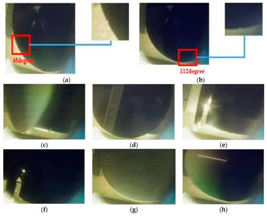 Wafer photo classification: (a) wafer with 45-degree notch, (b) wafer with 112-degree notch, (c) photos of the wafer during the 112-degree inspection process, (d) photos of the wafer during the 45-degree inspection process, (e) photos of the machine moving when the next wafer is placed, (f) photos of the bottom plate without the wafer, (g,h) photos of the conversion process between wafers with notches at different angles.