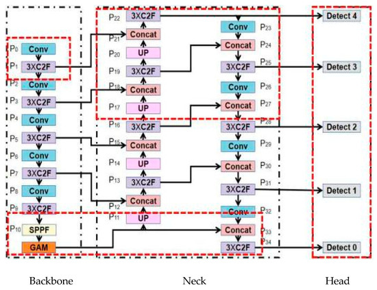This paper proposes an improved object detection model for real-time monitoring of wafer notches in Figure 4. In terms of improving detection accuracy, combining attention mechanisms is a common method. By adding an attention mechanism and filtering to find the channels with the greatest correlation, the features extracted from the channels with high correlation are mainly learned [10]. Because they have fewer parameters and higher performance, the accuracy of the model can be improved. After experimenting with various attention mechanisms, this study selected the excellent GAM to be integrated into the original YOLOv8 model. The integration of the GAM reduces the computational complexity and improves the accuracy of YOLOv8 in detecting wafer notches. In terms of detection heads, we introduced two additional detection heads to handle objects of different scales so that the detection of small objects is more accurate. The specific changes are shown in Figure 4, which is significantly different from Figure 1. All improvements are marked by the red dotted boxes.