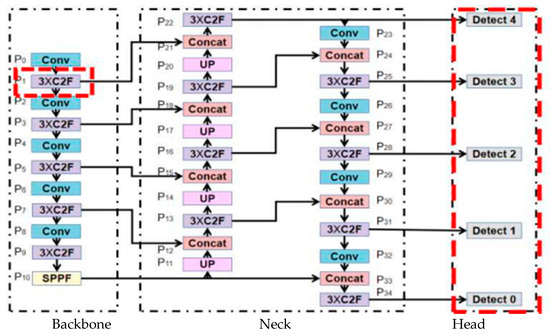 The network structure of YOLOv8 is divided into three parts, the backbone network, the feature enhancement network (neck), and the detection head, as shown in Figure 1. In the backbone network, the backbone network of YOLOv8 mainly uses five Conv modules, four c2f modules and one SPPF module, to complete the extraction of features of different sizes. In the feature enhancement network (neck), the YOLOv8 mainly adopts the idea of path aggregation network-featured pyramid networks (PA-FPN), but it removes some convolutions in the upsampling stage of PA-FPN so that the model’s architecture can be more concise, thus reducing the complexity of the model, reducing the amount of calculation and the number of parameters of the model, and thereby improving the reasoning speed of the model. In the detection head, YOLOv8 introduces a new module called the decoupling head, which separates the classification branch from the positioning branch, alleviating the inherent conflict between classification and regression tasks. In general, YOLOv8’s performance in target detection far exceeds that of other models of the same type.