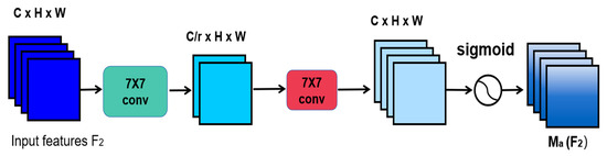 The channel attention submodule uses 3D permutation to retain 3D information, and then it uses two layers of multilayer perceptron (MLP) to amplify the channel–spatial dependencies across dimensions. MLP is an encoder–decoder structure with a reduction ratio of r, which is the same as the block attention module (BAM). The channel attention submodule is shown in Figure 7. In the spatial attention submodule (Figure 8), in order to focus on spatial information, the GAM uses two convolutional layers for spatial information fusion, and the reduction ratio r is the same as the channel attention submodule, which is the same as BAM. At the same time, maximum pooling will reduce the amount of information and produce negative contributions. These remove the pooling to further preserve the feature map.