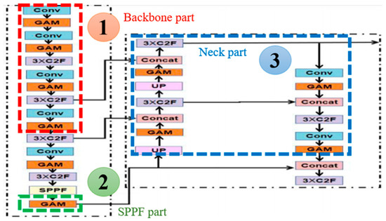 After choosing to use the GAM, we tried adding it in four different locations. The first option is to add the GAM after all convolutional layers in the backbone part (Figure 9➀) and select the features extracted by each convolution layer through the global module to strengthen important features. The second is to add the GAM after the spatial pyramid pooling-fast (SPPF) module of the backbone (Figure 9➁) and extract key feature information through the GAM module before the features enter the neck. The third is to introduce the GAM before the concept operation of the neck part (Figure 9➂) to further extract useful information to ensure that the effectiveness of the features can be improved before data fusion so that the fused features are more accurate. The fourth one is to combine the positions added in the previous three and finally add the GAM to all of them (Figure 9).