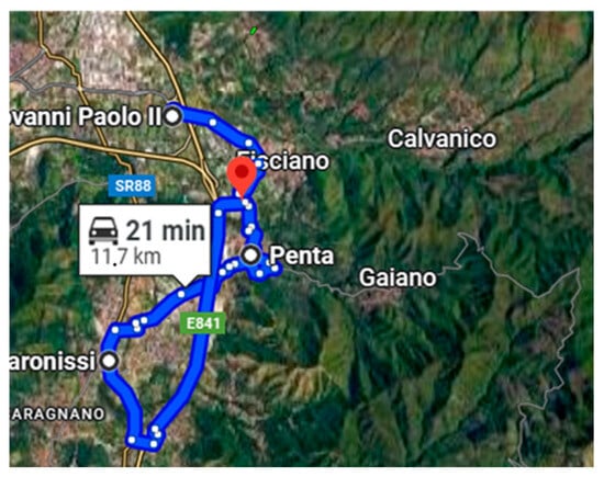 The analysis of survey results gave evidence of more used cars by travelers: the A-segment and a C-SUV segment. For this reason, two cars were chosen to conduct the on-road test: a Fiat Panda, which is a City Car belonging to the A-segment, and a Renault Arkana, belonging to the C-SUV segment. Both Fiat and Renault are classified as “Mass market car brands” in the “car brands pyramid” [40], so they can be considered as belonging to the same car class. The path chosen for testing was a city route that was 11.7 km long. The tests were carried out following the path in Figure 1, located in Fisciano (Salerno). The path included bumps, 90-degree turns, and traffic circles, as well as stop signs and downhill and uphill sections, in order to experience, as a passenger, the main critical road conditions that could bring a lower comfort condition.