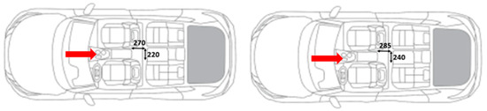 In Figure 2, the cameras’ point of view (red arrow) and the legs’ space, transverse and horizontal (in mm), are highlighted. The cameras were placed at the same point for both cars so that the passengers could be filmed from the same angle for the different tests. The camera used for the tests conducted on the Fiat Panda was that of the Google Pixel 7 smartphone, while a Xiaomi Mi action camera was used for the tests on the Renault Arkana.