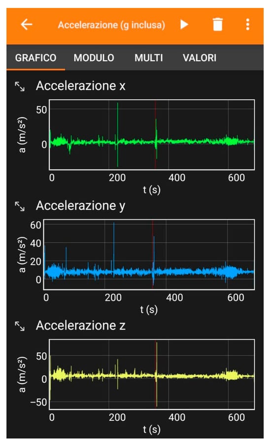 For the acceleration data, a Samsung smartphone with the Phyphox app installed was used [42]. It allows access to the accelerometers of the smartphone with a maximum sampling rate of 100 Hz. The smartphone was chosen because it was non-intrusive and car-independent (https://phyphox.org/, accessed on 25 July 2025). A screenshot of the application during data recollection is included in Figure 4.