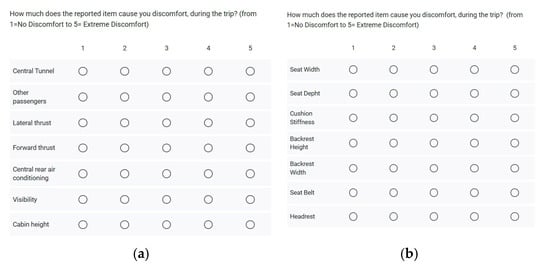 Excerpts from the discomfort questionnaire. (a) The seat’s characteristics and (b) interiors’ parts.