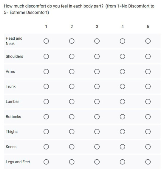 - Lastly, the third section was dedicated to investigating the physical discomfort perceived by participants, overall and in nine specific body regions (Figure 6).