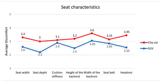 Average discomfort, for each seat characteristic and for each car, evaluated through the questionnaire.