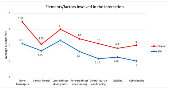 Average discomfort, for each elements/factors involved in the interaction and for each car, evaluated through the questionnaire.